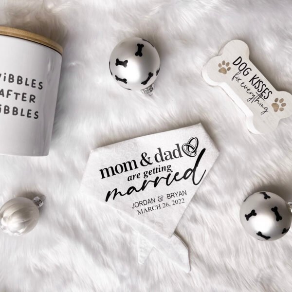 Let your furry friend announce your big news in style with the Mom & Dad Wedding Announcement Bandana! Featuring an elegant white design with bold black text and charming wedding-themed accents, this bandana is the perfect way to share your special day. Personalized with names and the wedding date, it’s a memorable keepsake and a fun accessory for engagement photos or save-the-date announcements. Crafted from soft, high-quality fabric, this bandana ensures your pet looks picture-perfect while celebrating your love story.